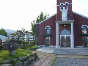 - 곡성 성당 곡성 옥터 성지 표지석과 예수성심상